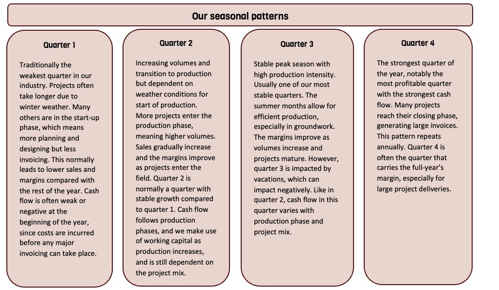 Netel’s operations follow clear, recurring seasonal patterns related to project life cycles, customer investment plans and weather conditions. These patterns impact volumes, margins and cash flows. Given how our project mix looks this year, we expect slightly lower activity in the beginning of the first quarter than last year. This is due in part to many projects in the start-up phase, which includes preparatory work such as design and planning, and in part to the winter weather that means that we have to wait to start some production. We expect larger production volumes, primarily during the second half of the year.